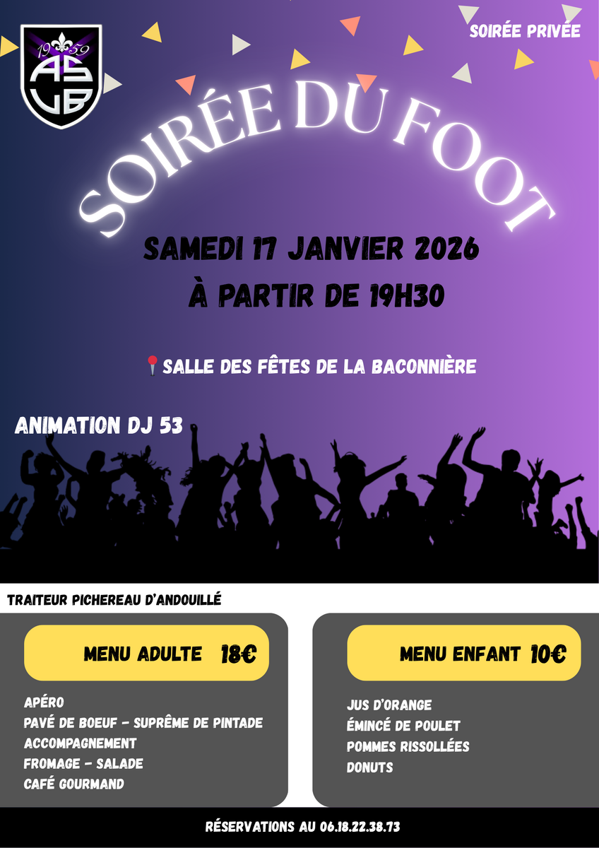 La soirée du foot aura lieu le Samedi 17 janvier 2026 à partir de 19h30 Salle des Fêtes de La Baconnière.